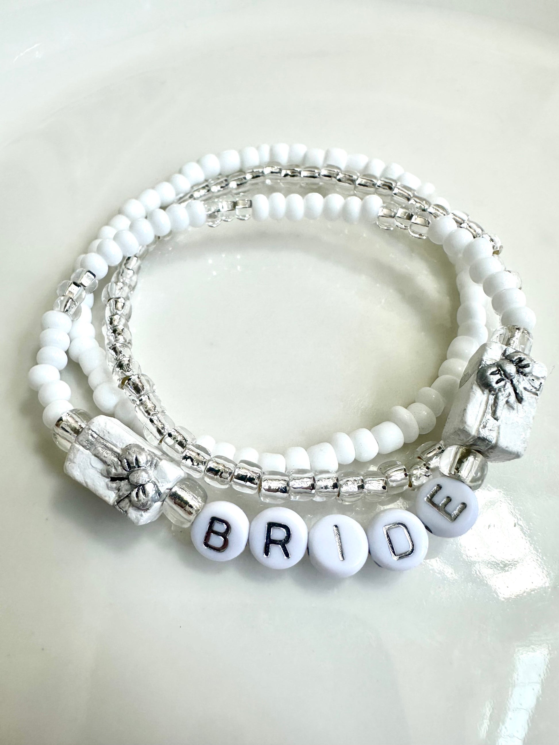 βSay βI doβ in style! π This chic white and silver BRIDE bracelet stack is the perfect accessory for bachelorette parties, bridal showers, or your big day.β