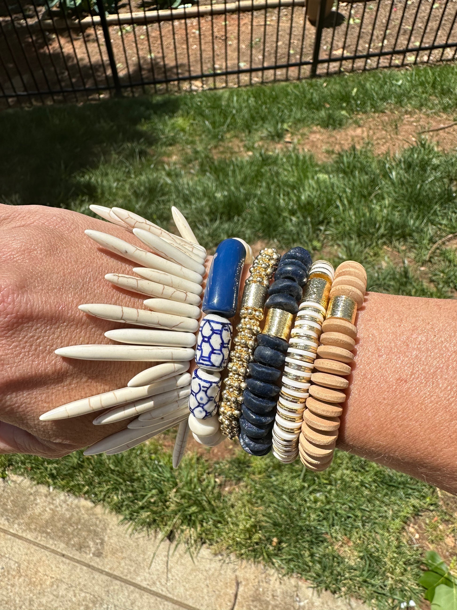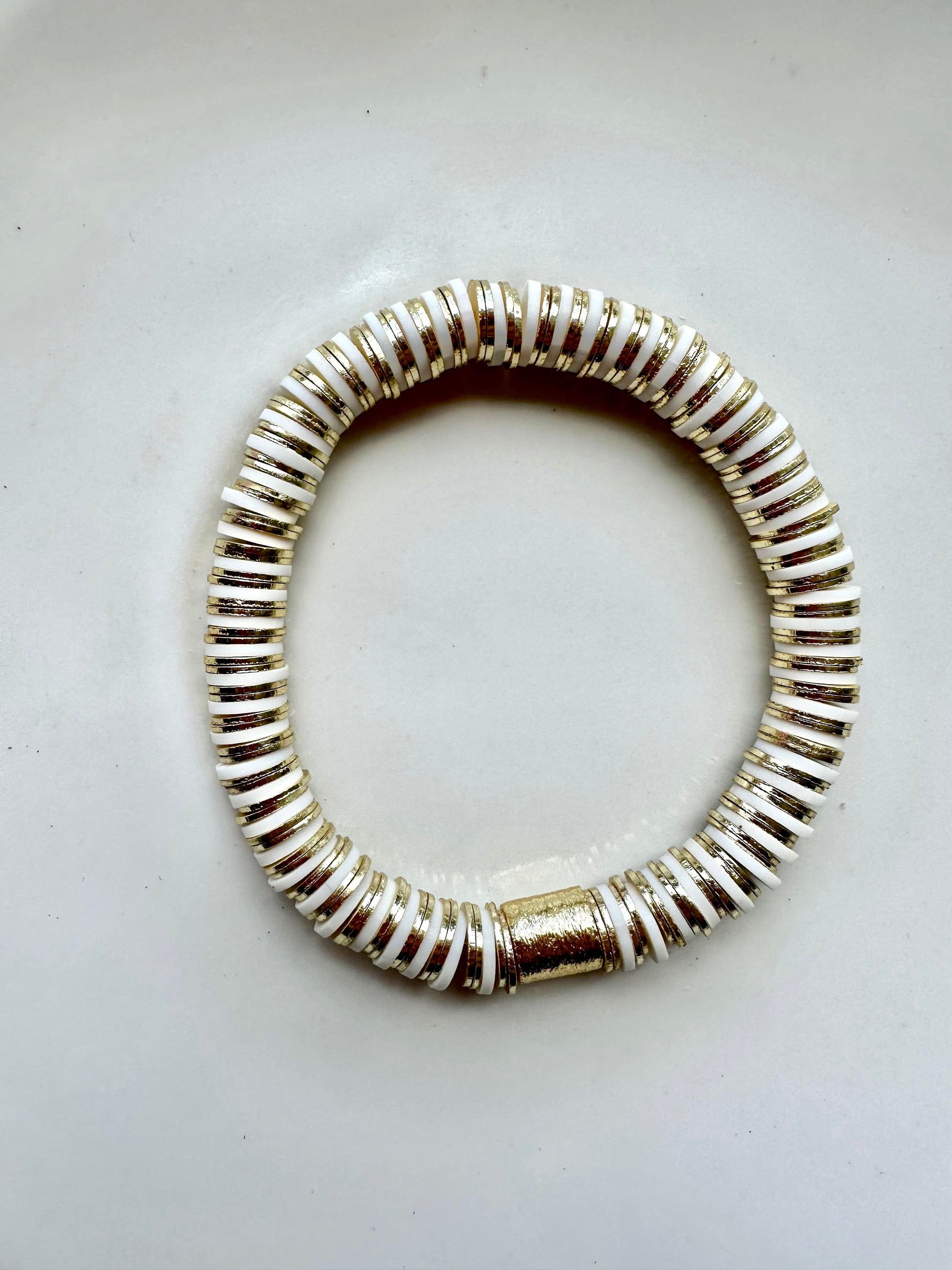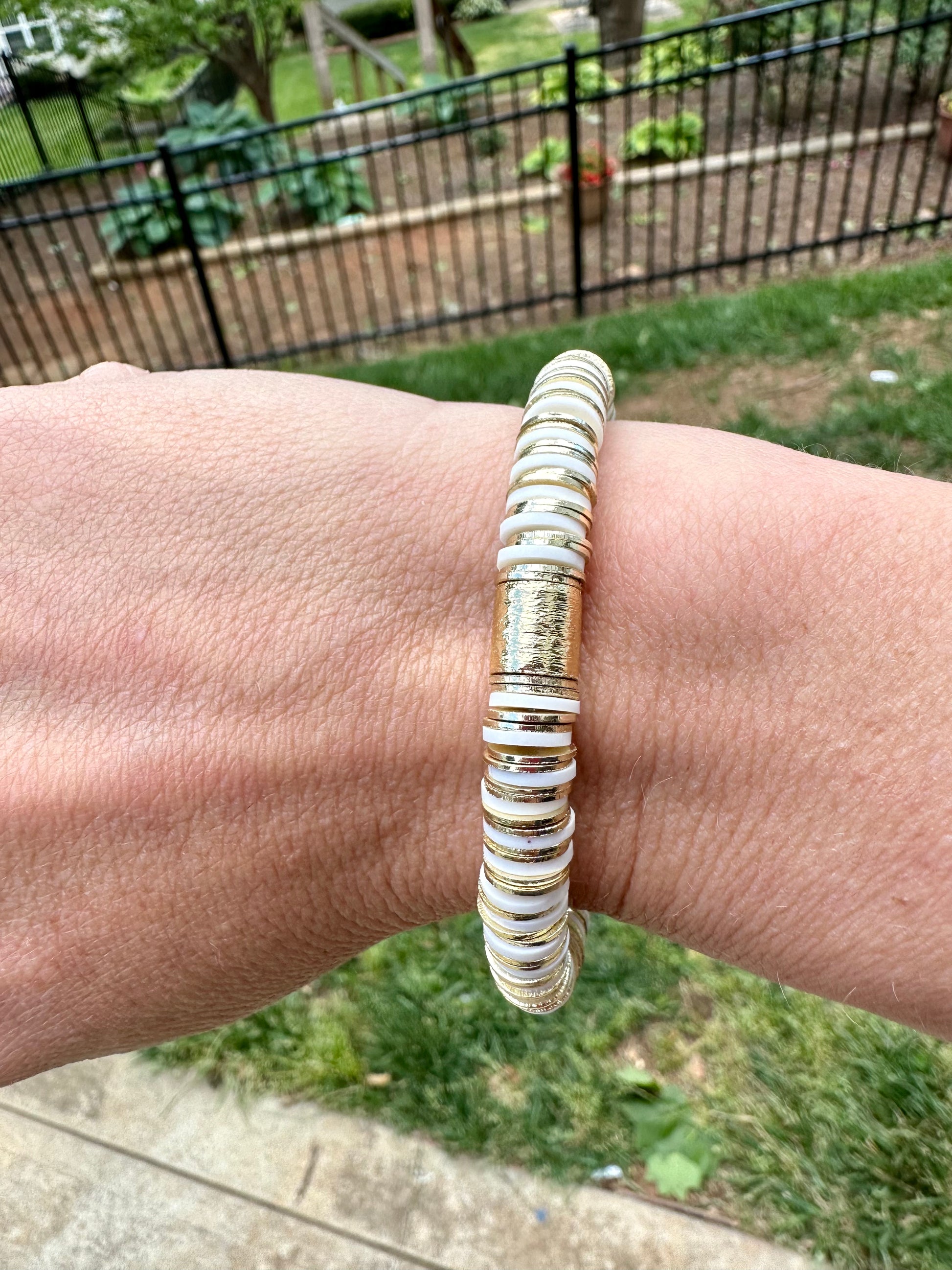 The white gold pattern bracelet is simple and elegant. This is one you can add to dress up or could be worn by its self. It’s one of my main go to bracelets. It’s made out white heishi beads and 14K gold disc beads. This is 8mm bead size.
